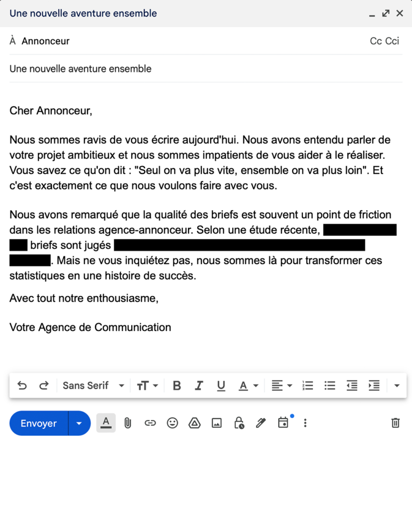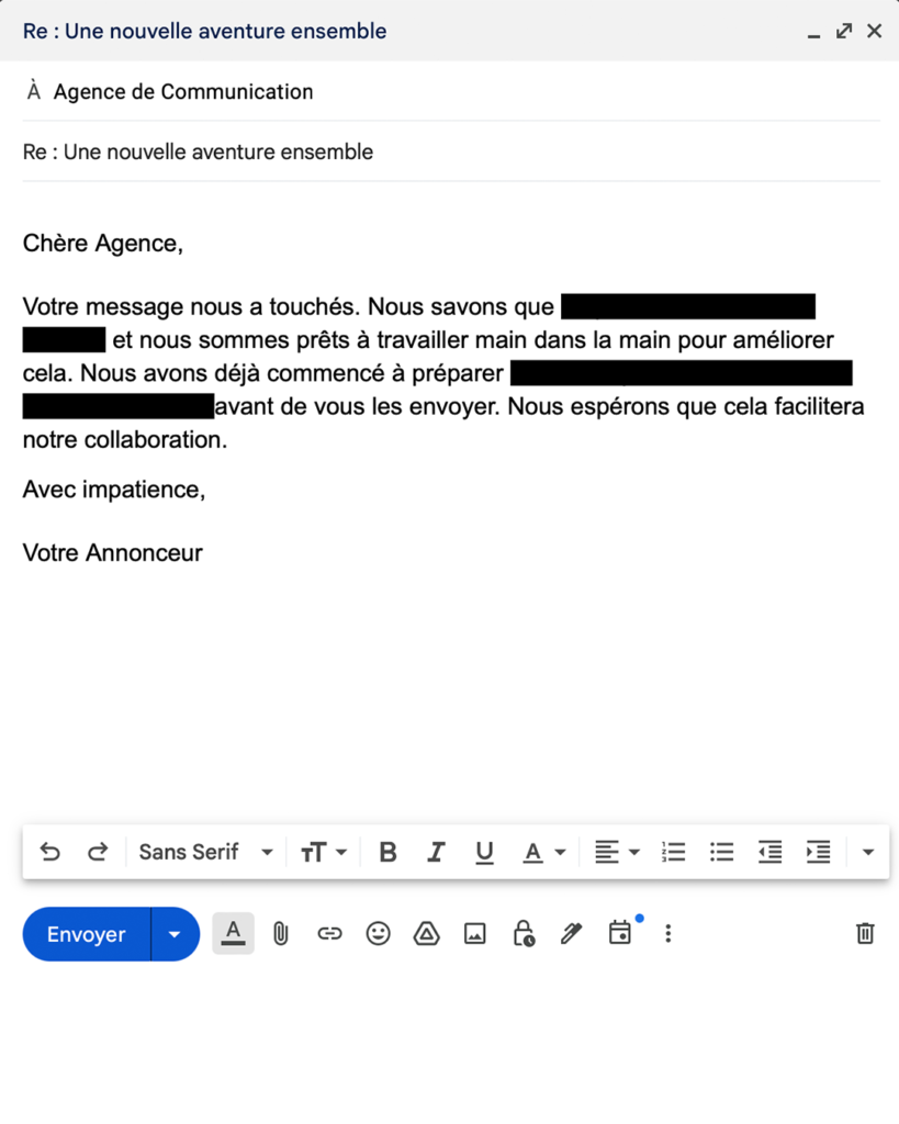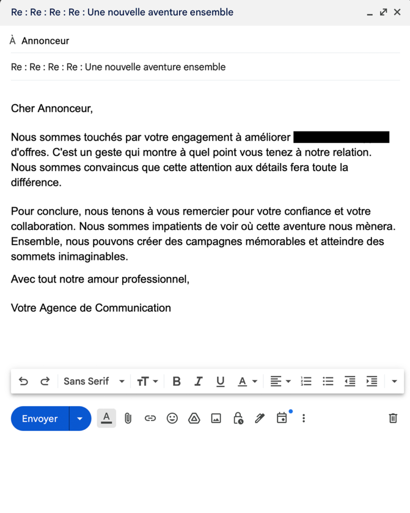 Ah, l’amour… Ce sentiment qui fait battre le cœur des poètes et des rêveurs. Mais saviez-vous que l’amour peut aussi être le moteur d’une relation professionnelle réussie ? Aujourd’hui, à l’occasion de la Saint-Valentin, nous vous proposons une correspondance épistolaire entre une agence de communication et son annonceur. Une histoire d’amour professionnelle, où chaque mot est une promesse de succès et chaque échange, une étape vers l’excellence.
